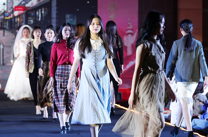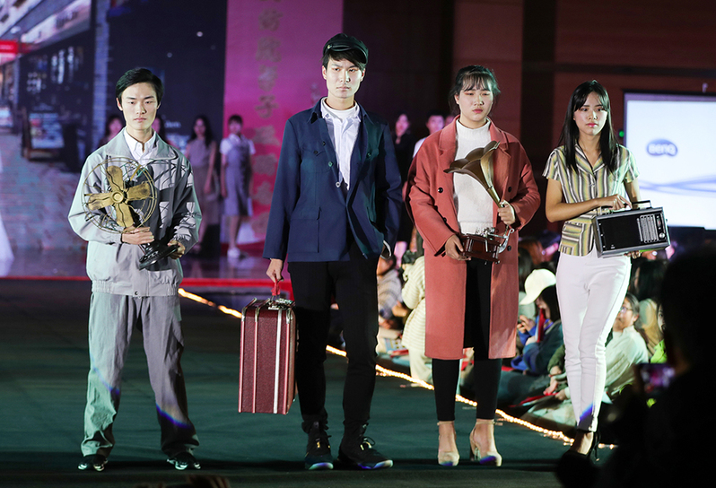 服装,是社会文化的产物,承载着人们深层次的精神需求。改革开放以来,社会生产力飞速发展,这四十年中人们衣着的变化,是物质文明和精神文明共同进步的写照。在《青苹果乐园》《童年》《外婆的澎湖湾》《光辉岁月》《明天会更好》等80、90年代的经典旋律中,以公司2018级新生为主体的50余名同学向观众们展示了改革开放四十年来有代表性的生活物件、现代蓝印花布服饰、中华历代经典服饰、流行影视服饰以及现代礼服等。T台上,一件件喇叭裤、花色格子裙、高腰卫衣、格子背心裙、网纱短袖、健美裤、雪纺连衣裙、丝绒长袖旗袍、雪纺泡泡袖上衫、百褶裙、婚纱西服、老式二八加重自行车、留声机、收音机、老式电风扇、皮箱等让现场观众重温了改革开放四十年带来的巨大变化,共展出服饰、物件60余种。最终,晚会在音诗画《盛世中国》的激情朗诵中落下帷幕。