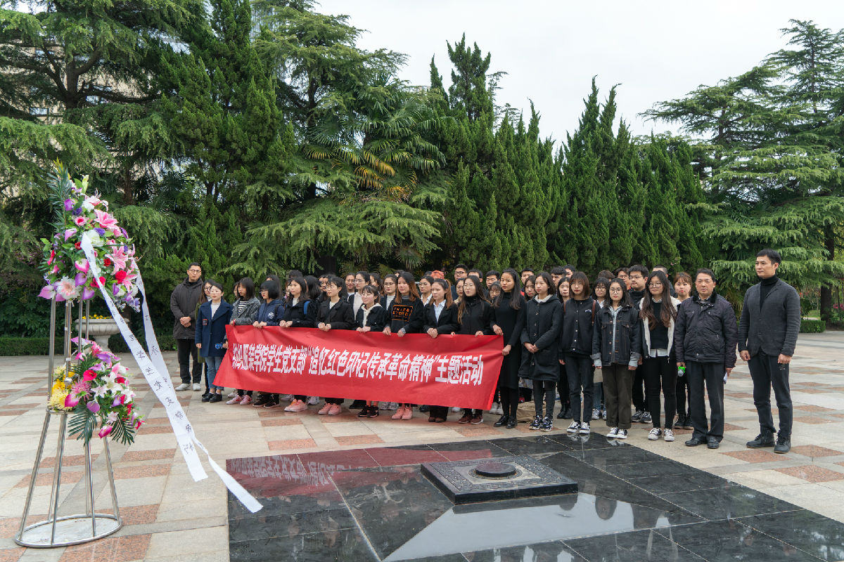 在革命烈士纪念碑前,师生代表敬献花圈,全体列队默哀,致敬、缅怀革命先烈,并面向党旗重温入党誓词。