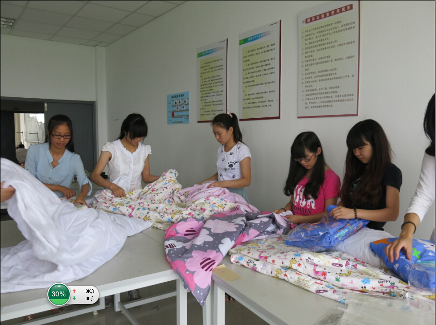 这批儿童夏被在教学实践环节制作完成,由教师指导组织、员工制作,从选购材料、裁剪缝纫到包装历时一个月,凝聚了师生对福利院儿童的一片爱心。