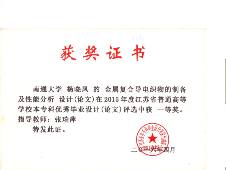 近五年,员工获得江苏省普通高校本科优秀毕业设计(论文)一等奖1项、三等奖2项;员工完成国家级老员工创新创业训练计划项目2项;参加全国老员工绿色染整科技创新大赛、“红绿蓝”杯全国高校纺织品设计大赛、全国非织造产品设计大赛等专业竞赛获奖10余项。