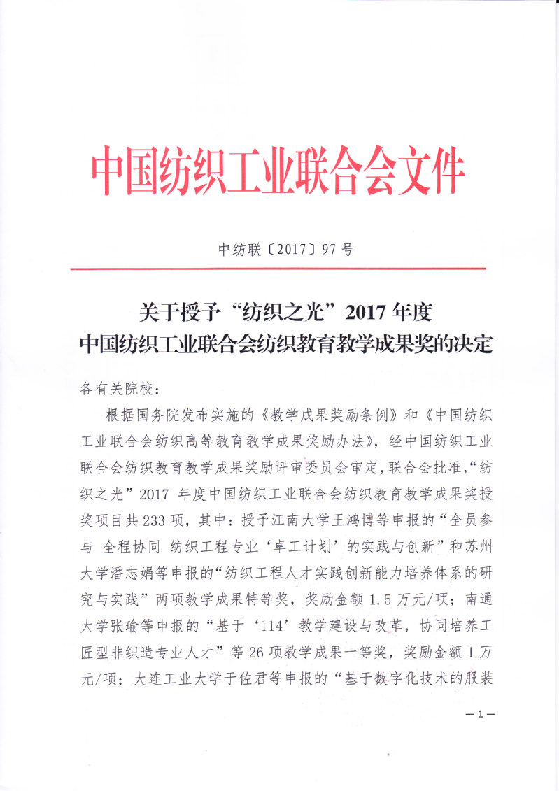 关于授予“纺织之光”2017年度中国纺织工业联合会纺织公司产品成果奖的决定