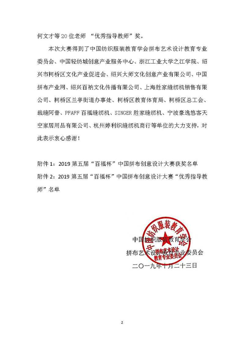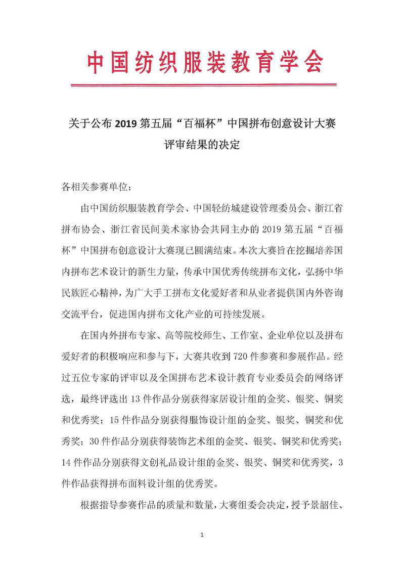 关于公布2019第五届“百福杯”中国拼布创意设计大赛评审结果的决定