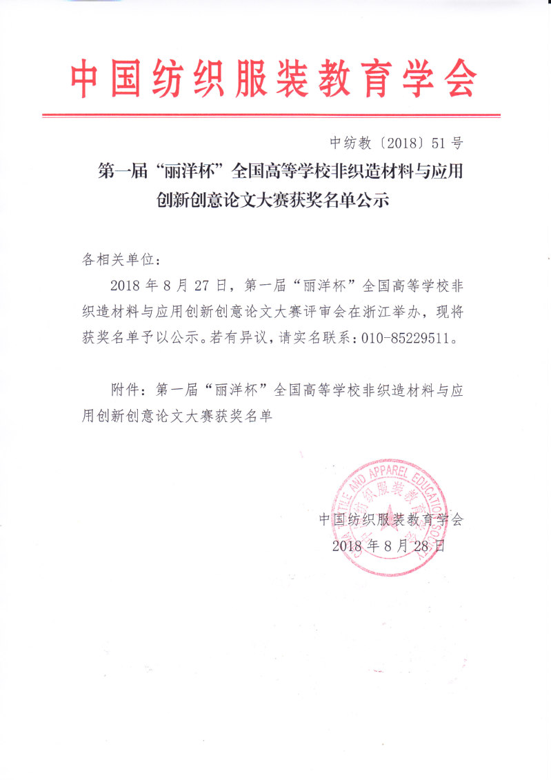 第一届“丽洋杯”全国高等公司非织造材料与应用创新创意论文大赛获奖名单公示
