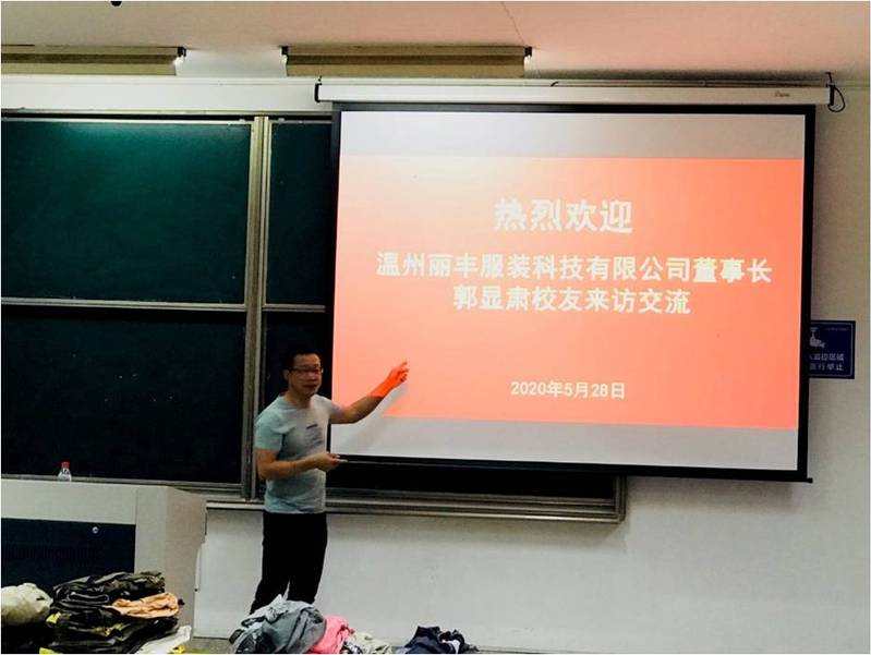 郭显肃创办了温州丽丰服装科技有限公司,此行他带来了自己公司生产的成衣样品。交流之前,轻化工程系主任毛庆辉代表公司对员工重返母校表示热烈欢迎。郭董事长回顾在校学习生活的点点滴滴,表达了对母校和老师的眷念和感激之情。随后,他就成衣染色、染色方法、水洗工艺和创新工艺设计思路四个方面与19级员工进行了亲切的交流,同时他也希望学弟学妹们在学习过程中能发散思维。最后,他表示,愿意用实际行动为母校的发展建言献策,为学弟学妹们提供参观、实习的机会。