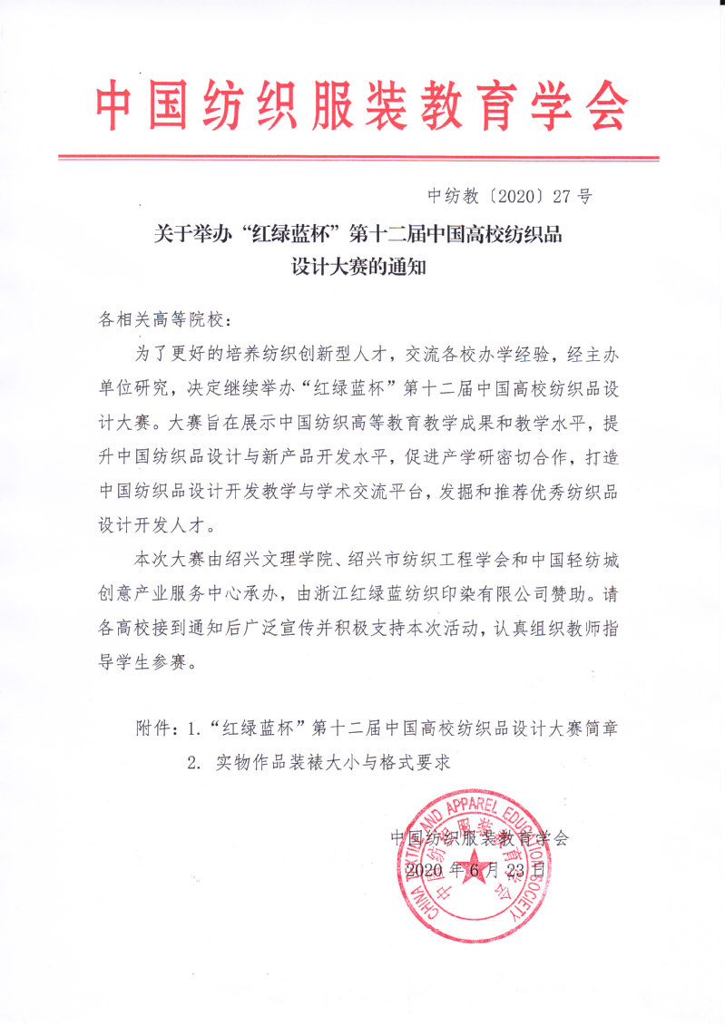 关于举办“红绿蓝杯”第十二届中国高校纺织品设计大赛的通知