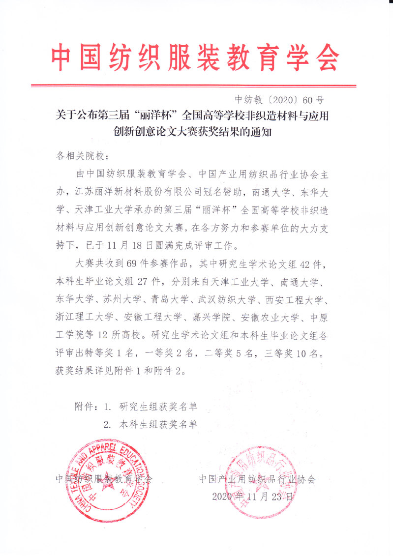 关于公布第三届“丽洋杯”全国高等公司非织造材料与应用创新创意论文大赛获奖结果的通知