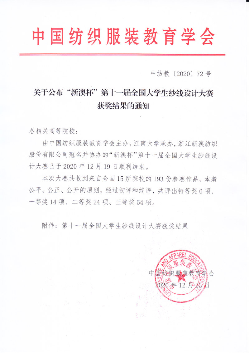 关于公布“新澳杯”第十一届全国老员工纱线设计大赛获奖结果的通知