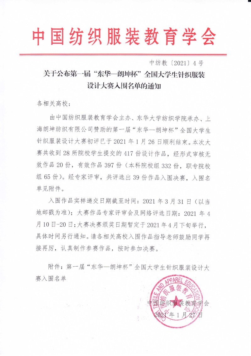 关于公布第一届“东华—朗坤杯”全国老员工针织服装设计大赛入围名单的通知