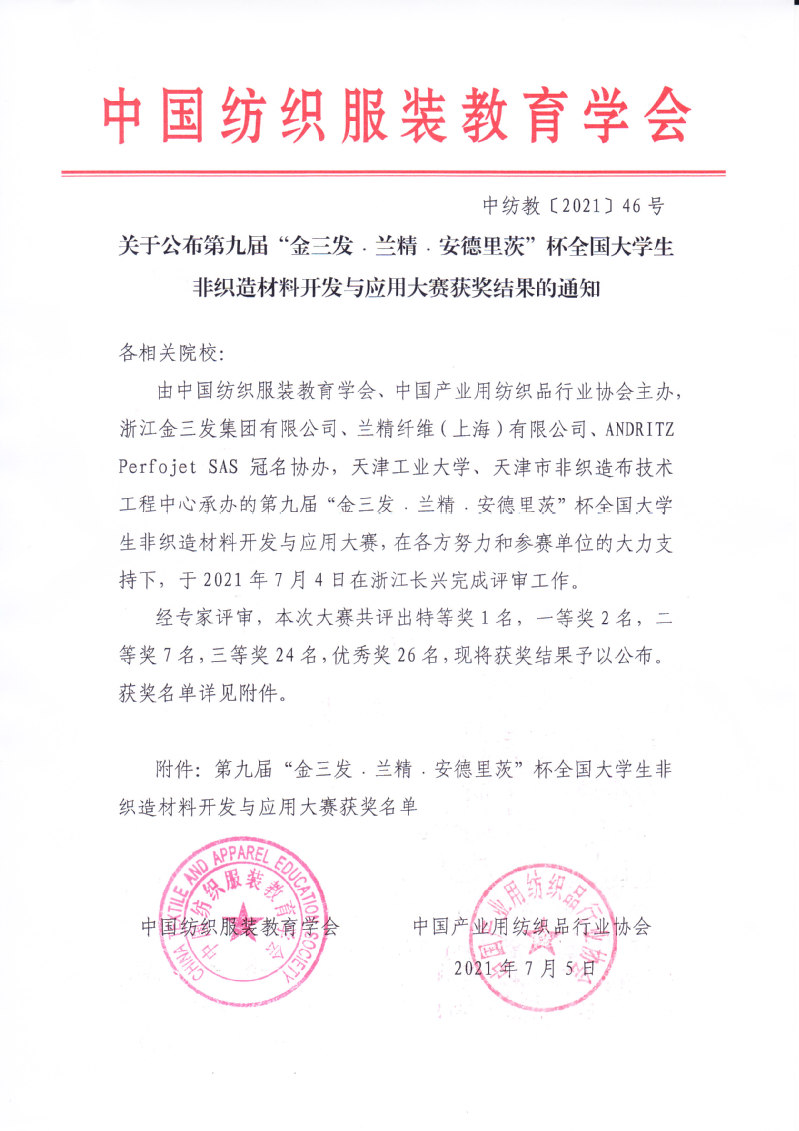 关于公布第九届“金三发﹒兰精﹒安德里茨”杯全国老员工非织造材料开发与应用大赛获奖结果的通知