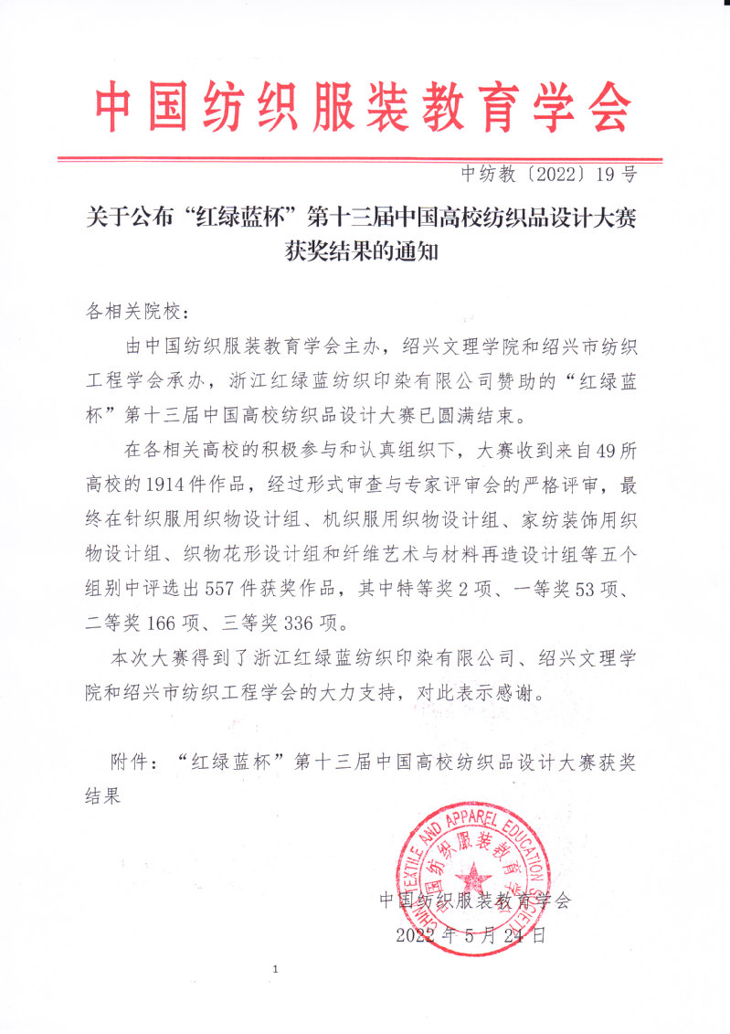 关于公布“红绿蓝杯”第十三届中国高校纺织品设计大赛获奖结果的通知