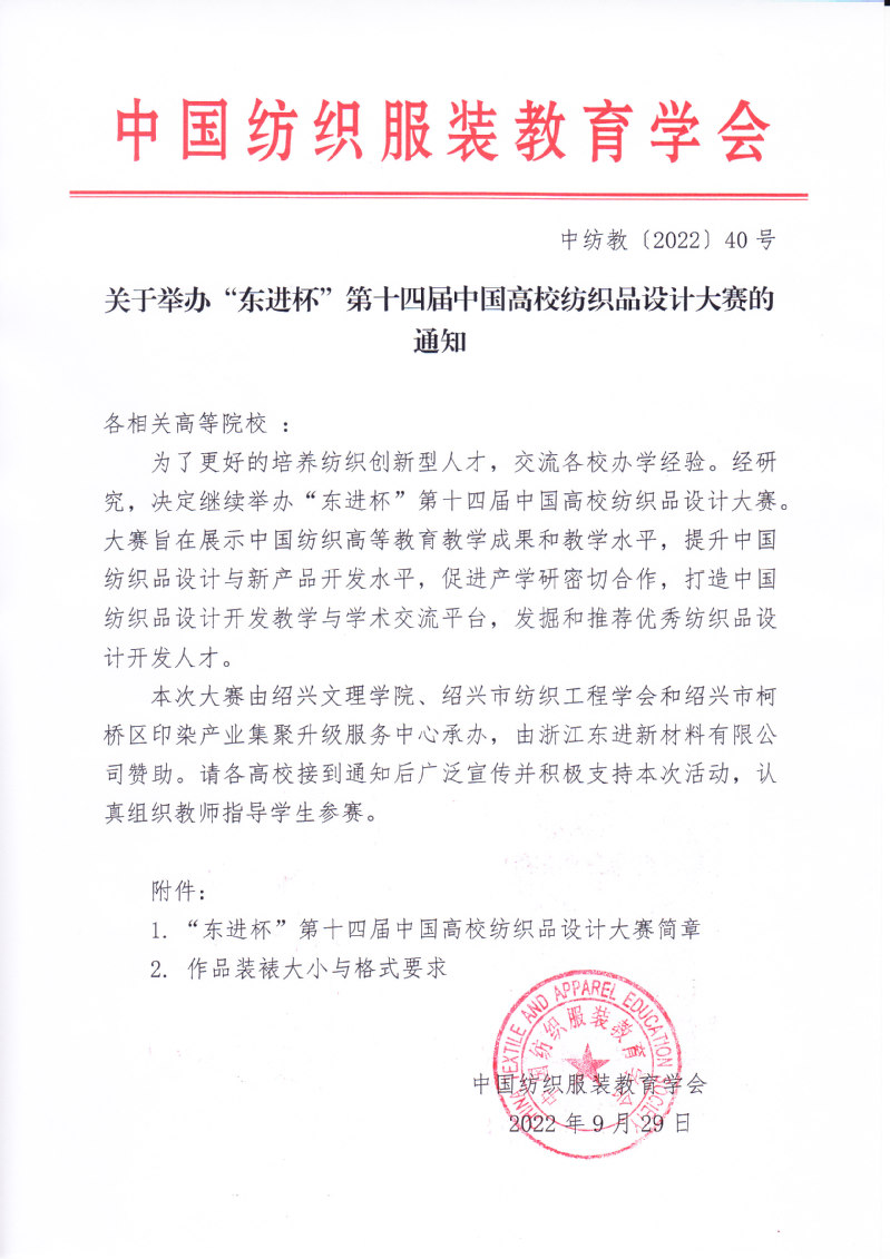 关于举办“东进杯”第十四届中国高校纺织品设计大赛的通知