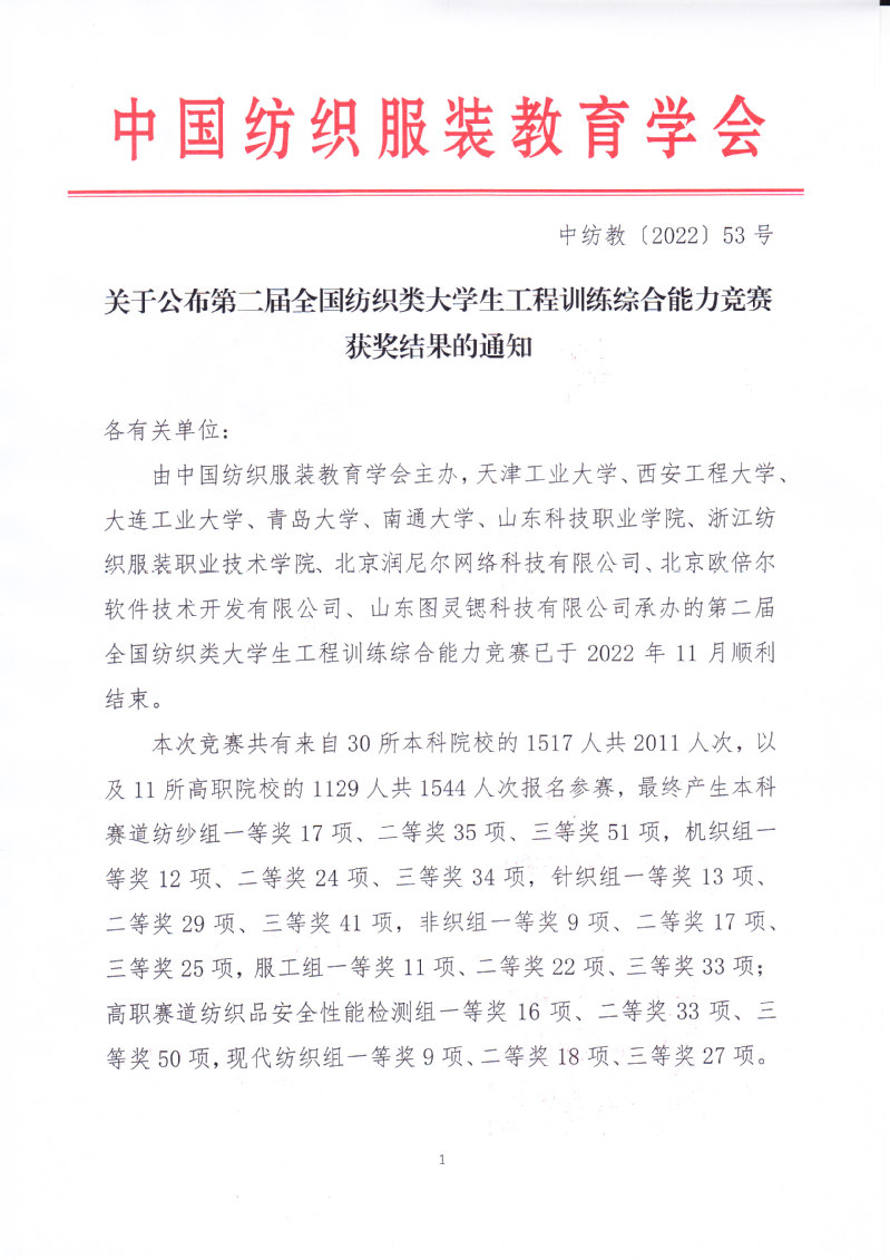 关于公布第二届全国纺织类老员工工程训练综合能力竞赛获奖结果的通知