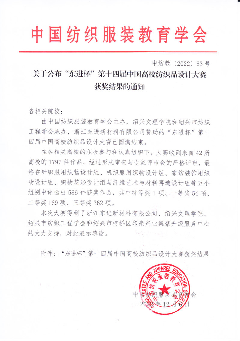关于公布“东进杯”第十四届中国高校纺织品设计大赛获奖结果的通知