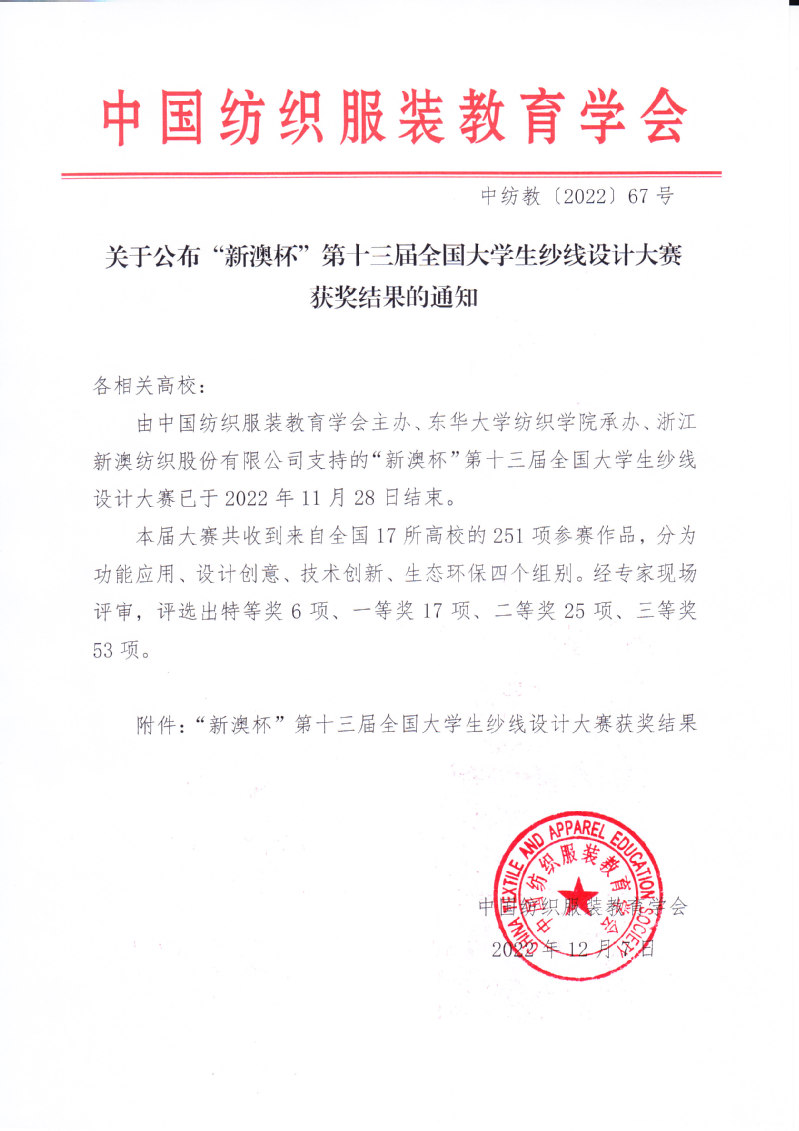 关于公布“新澳杯”第十三届全国老员工纱线设计大赛获奖结果的通知