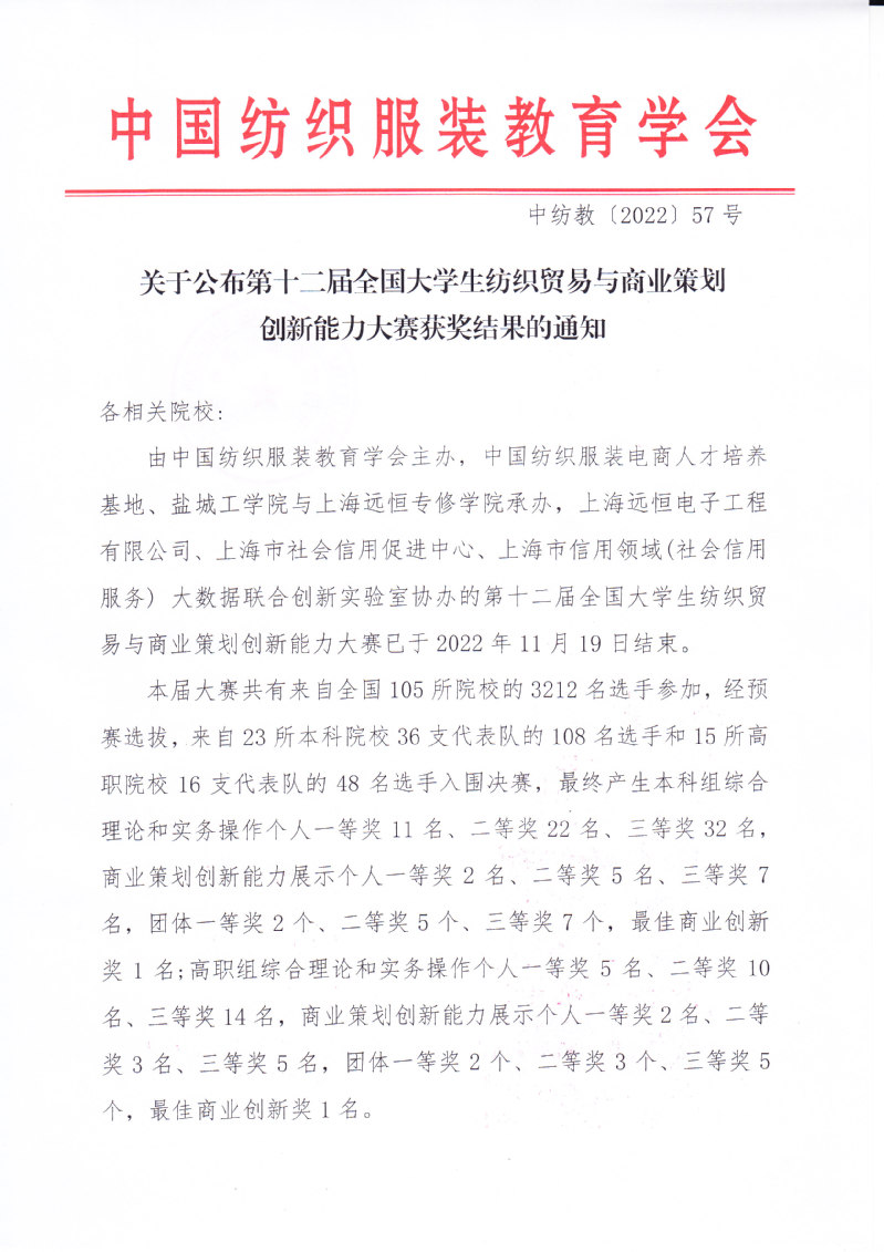 关于公布第十二届全国老员工纺织贸易与商业策划创新能力大赛获奖结果的通知