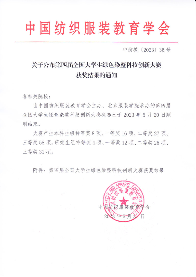 关于公布第四届全国老员工绿色染整科技创新大赛获奖结果的通知