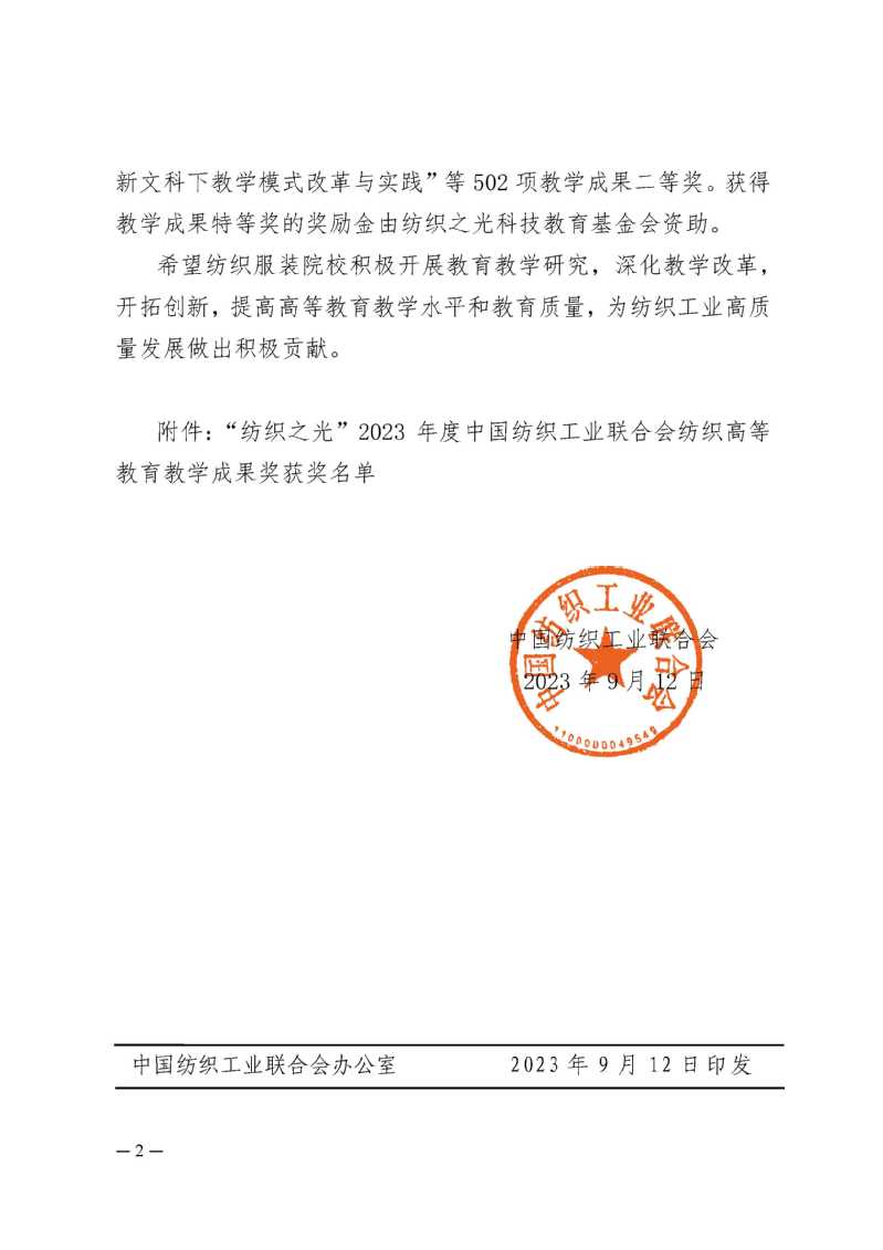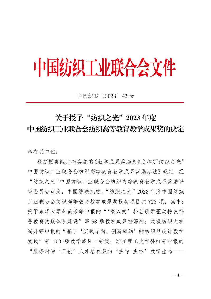 关于授予“纺织之光”2023年度中国纺织工业联合会纺织高等公司产品成果奖的决定