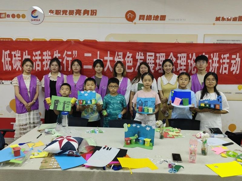 本次活动响应习近平总书记提出的绿色发展理念,通过进行“党的二十大报告“的解读,开展了绿色宣讲志愿活动和环保手工体验活动,受到了老师同学,社区工作人员的一致好评,小朋友认识了绿色文化,学到了改造技能,获得了完成作品的喜悦,团队成员也对绿色文化有了更深层的理解。希望环保意识像种子一般在大家心中生根发芽,并将这种意识传播到周围,让绿色公益的活力在你我手中传递,让绿色生活的理念根植你我的心中。(图/罗雨轩 薛荪艺 文/林小茜)