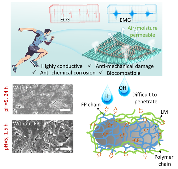 通过引入含氟聚合物,通过简单的超声法实现了液态金属在水性聚氨酯中的均匀分散,烘干成膜后得到液态金属弹性聚合物复合材料。液态金属聚合物复合材料表现出优异的传感能力,能够实时检测人体各个关节运动以及讲话时人体喉咙肌肉的微小变化。通过热压将液态金属聚合物复合材料与织物相结合,得到的液态金属电子纺织品保留了织物自身的高透气性和高透湿性,实现智能可穿戴的同时对人体舒适性友好,可以作为生物电极检测人体的肌电图和心电图。由于高导电性和高导热性,也能作为热疗贴片在0.4~2.0 V的下电压下对人体进行类风湿性关节炎的治疗。
