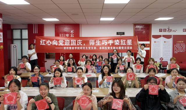活动现场,师生共同探讨、熟悉五角星的扎法,并携手调配出红色染料,经由折、夹、扎、缀、染等步骤,最终在一块块素布上印染出一颗颗鲜亮的红色五角星。活动过程中穿插的紧张刺激的知识竞答环节、温馨感人的明信片寄语活动以及激昂高亢的《歌唱祖国》大合唱,更是掀起一阵阵热潮。这是一次对传统工艺的致敬与创新融合,也是现场师生内心深处爱国情怀和文化自信的生动写照与深情传递,为即将到来的中华人民共和国75周年华诞增添了一抹青春亮丽的生动色彩。