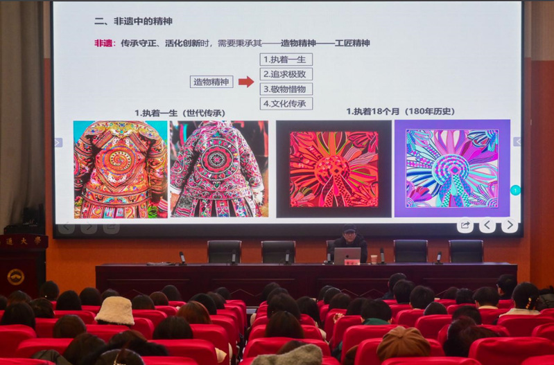 贾京生结合自身长期的田野调查经验,以“非遗”与“物遗”概念解析为导入,结合中国西南族群防染与法国爱马仕印染工艺,围绕非遗中的精神、智慧与审美进行深入分析。他指出,“传承守正,活化创新”的非遗,蕴含着执着一生、追求极致、敬物惜物、文化传承等宝贵的造物精神与工匠精神,也蕴藏着因地制宜、因材施艺的艺术智慧与无与伦比的工艺之美、图案之美。他表示,在坚定文化自信进行中西文明互鉴的过程中,在地族群需要守住精湛多元、博大精深的中国传统文化,做到守正传承、保留文脉;设计族群需要充分利用博大精深的中国传统文化、挖掘设计灵感,坚持以文化为主题、为核心与灵魂,以形式为载体,呈现文化内涵,讲好中国故事。