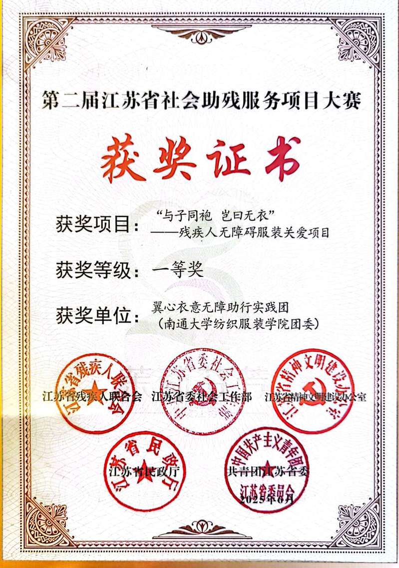 6月20日至21日,第二届江苏省社会助残服务项目大赛暨长三角地区社会助残服务项目分享会在南京成功举办。本次大赛由江苏省残疾人联合会、省委社会工作部、省文明办、省民政厅、共青团江苏省委联合主办。经过激烈角逐,williamhill“翼心衣意”无障助行实践团的“与子同袍 岂曰无衣——残疾人无障碍服装关爱"项目凭借设计创新和科技赋能,从174个申报项目中脱颖而出,荣获大赛一等奖。