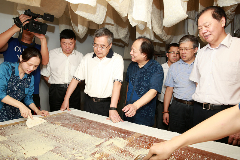 文化部原副部长项兆伦考察蓝印花布艺术研究所