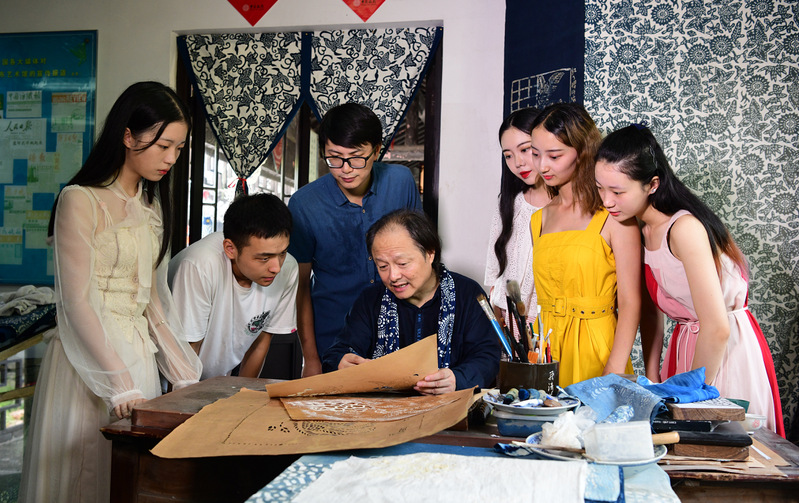 蓝印花布艺术研究所所长吴元新指导员工蓝印花布刻花版工艺